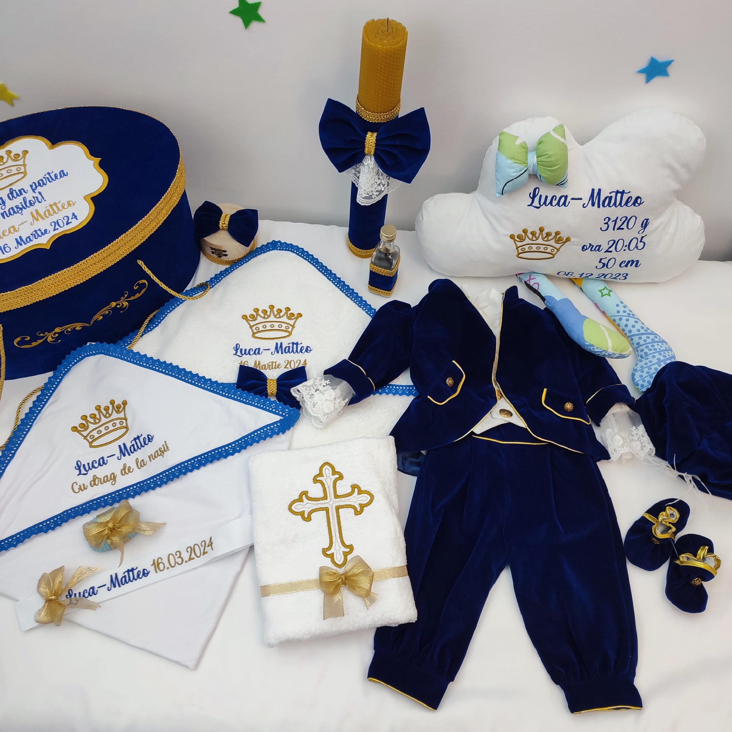 Trusou clasic – set complet pentru botez, elegant și rafinat, realizat din materiale de calitate, cu detalii delicate și finisaje premium.